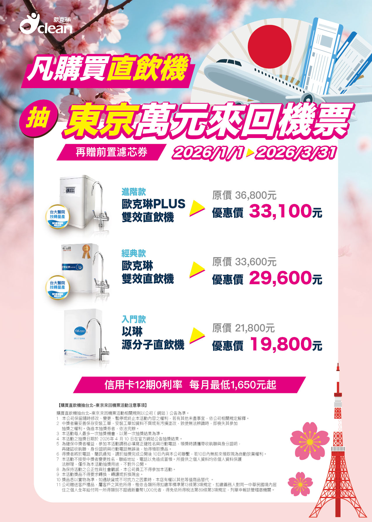 【我要東京來回機票!】歐克琳PLUS雙效直飲機